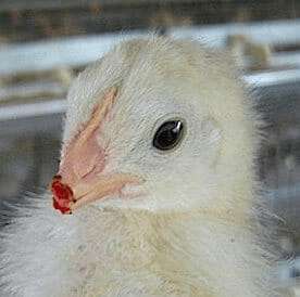 Our hen is female, so she survives this initial selection. She is moved on a conveyor belt to a debeaking machine. This machine uses a hot blade to cut off one-third to one-half of her beak. The procedure is performed without anesthesia.