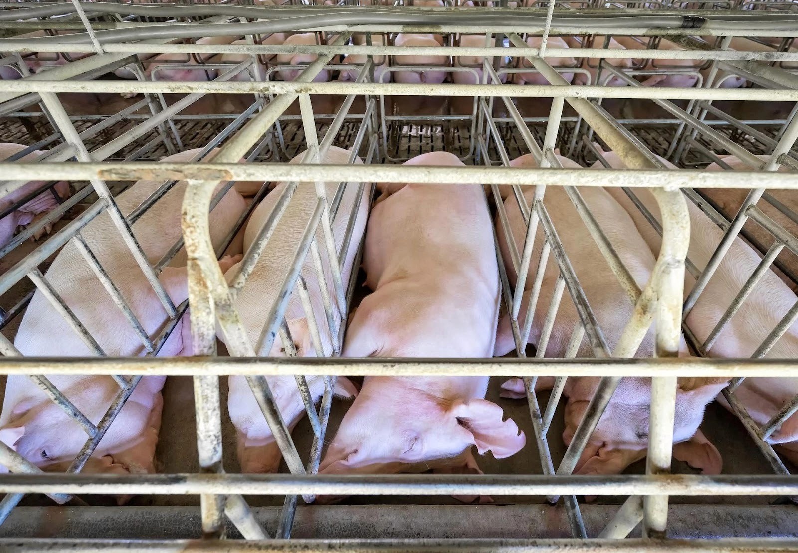 The suffering doesn't stop after the acute pain. Pigs confined in gestation crates, metal cages so narrow they cannot turn around, develop stereotypies: repetitive, purposeless behaviors that only emerge under conditions of severe psychological distress. They bite metal bars for hours until their teeth break and their gums bleed. They chew empty air compulsively, a behavior with no function, performed because they're losing their minds. They press their snouts against bars until open sores form. These are not normal pig behaviors. These are signs of severe mental breakdown, the same kinds of behaviors you see in humans with untreated schizophrenia or in prisoners kept in solitary confinement.